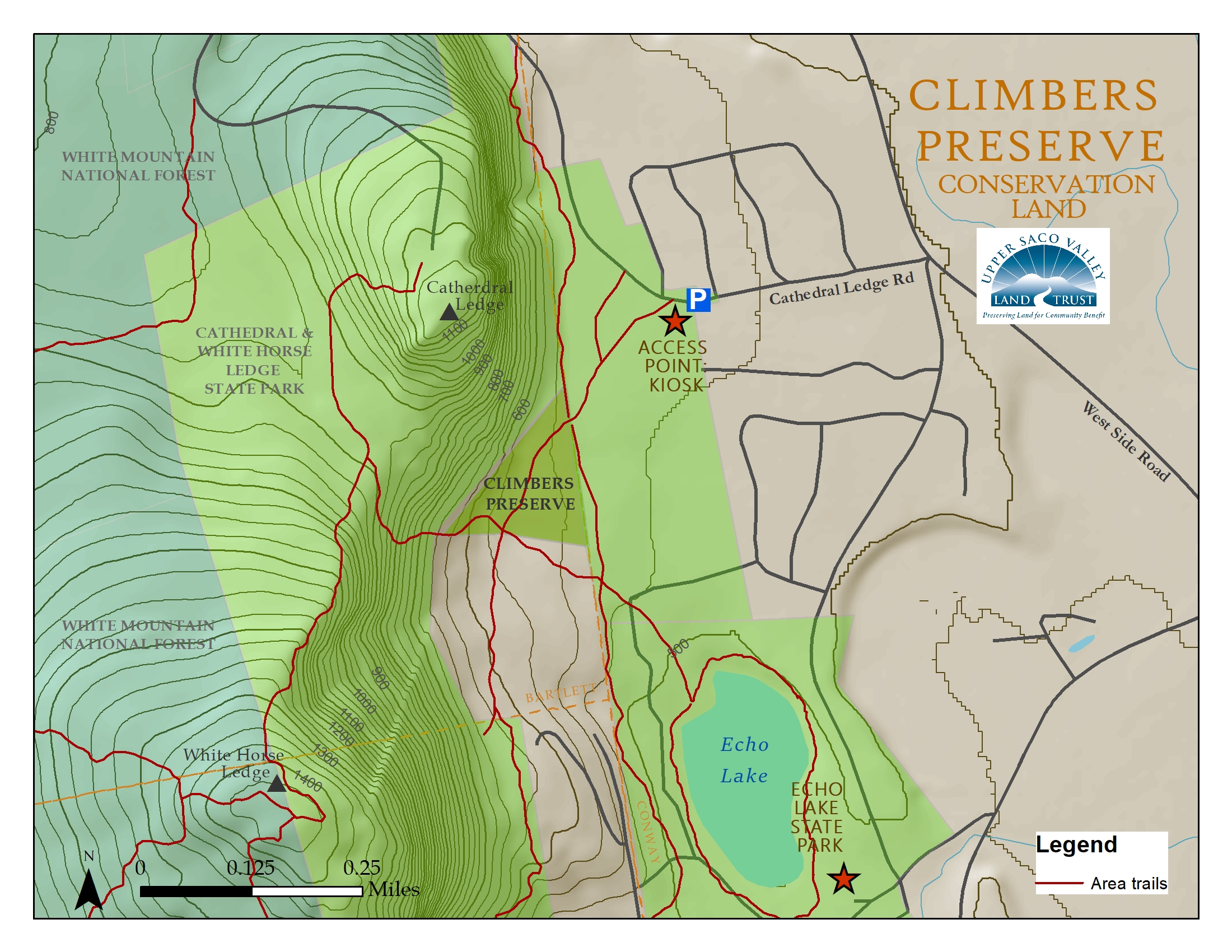 The Climbers’ Preserve, located at the bottom of White Horse Ledge and Cathedral Ledge on the town line between Conway and Bartlett, was donated to USVLT in 2018 by Jim Ansara. USVLT partnered with the Access Fund and the Friends of the Ledges to raise the funds for the stewardship endowment for the 9 acre parcel. By April 2019, the endowment was completed, ensuring the property’s future protection.
